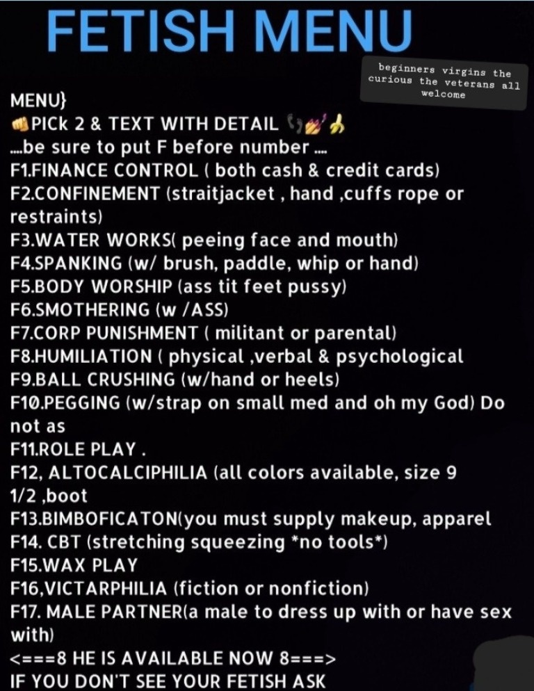 .#40 NEW 🚍WINDSHIELD WIPER....tongue floating side to side while .dicks in mouth #41 PETTING KITTY.. . playing with pussy while getting bbj #42 MENU LOCATED IN PHOTOS ... ............................ TEXT when you are ready for an amazing experience for fetish, please ...F then # IF you don't see your style, kink, fetish .. let me know. THANK YOU. 🏠INCALL🏠QV $100 =15 min.ONLY BBJ. NO MENU PICKS HHR $150 = 2 picks menu bbj...HR $200 =4 menu picks with full service FETISH [from menu 3] 2 PICKS..... RATES ARE THE SAME 🚘OUTCALL 🚘 $200+ UBER or DEPOSIT (reg clients uber or deposit exempt). includes FULL SERVICE =4 MENU PICKS. .{.please note: If I don't get back to you right away, it's because I am in session. WHILE IN SESSION. MY FOCUS IS ON MY CLIENT, NOT MY PHONE. } I will get back to you when I am DONE. #F17 UNAVAILABLE